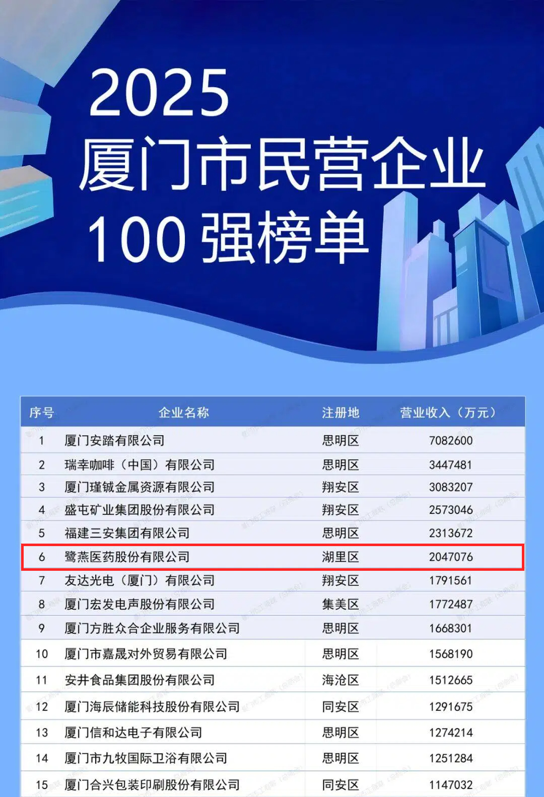 11月1日上午,2025年廈門企業家日大會召開。大會發布了2025廈門市民營企業100強系列榜單,介紹了廈門市民營經濟發展態勢和營商環境建設成效。鷺燕醫藥股份有限公司憑借上市企業綜合實力,榮膺“2025廈門市民營企業100強”第6位,以及“2025廈門市民營企業服務業50強”第4位。